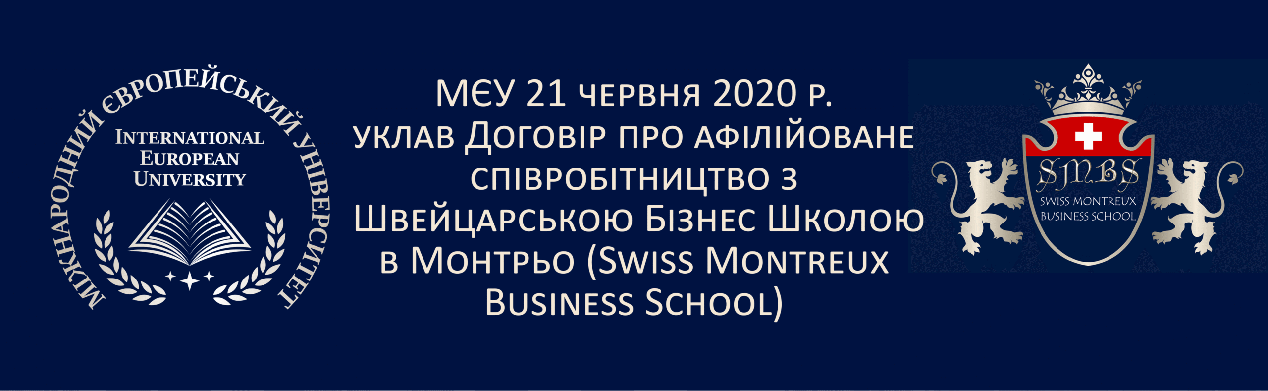 Міжнародний Європейський Університет 21 червня 2020 р. уклав Договір про афілійоване співробітництво з Швейцарською Бізнес Школою в Монтрьо (Swiss Montreux Business School) http://smbs-montreux.ch/, що гарантує європейську якість освіти, визнаним взірцем якої є швейцарський рівень. Документ підписали Директор з прийому Ендрю Тасун та Ректор Університету професор Сергій Куріло в присутності Директора Європейської Школи Бізнесу Ольги Чатченко (на фото зліва направо):
