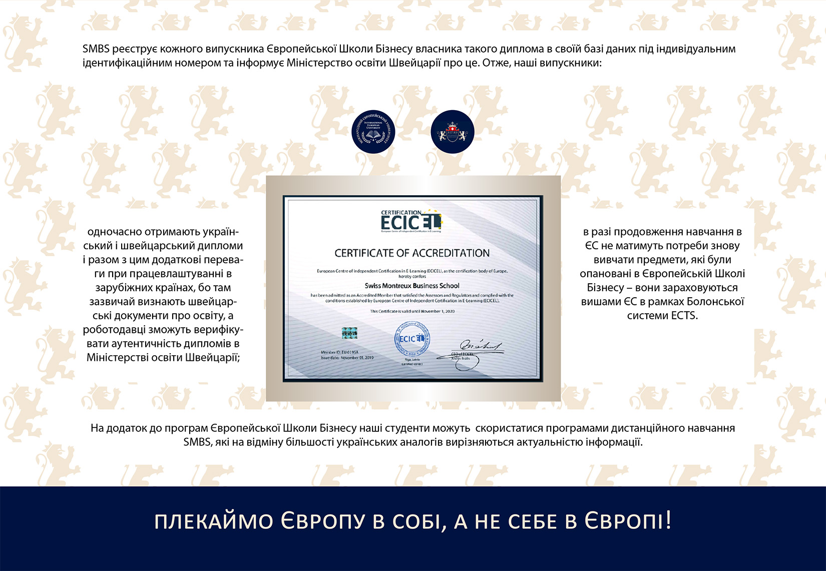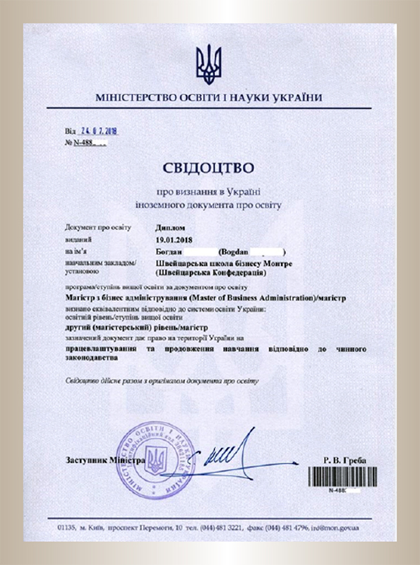 Згідно з Договором наші випускники – бакалаври і магістри – разом з українським дипломом про вищу освіту отримають і швейцарський диплом від SMBS, який визнається навчальними закладами і роботодавцями світу http://swissmba.tilda.ws/.
